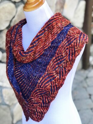 The shawl is worked end to end in two-color brioche stitch and the size is easily adjustable. This is an excellent pattern for those with some brioche experience.