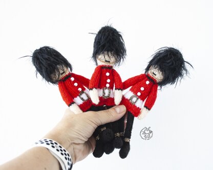 Materials needed: • 2 needles in a size suitable for the yarn weight you are using. I recommend using needles a size or two smaller than the yarn calls for, to produce a firm fabric. İ used Needles size 0 (2mm). • Red, black, white, cream colored yarn Special Stylecraft DK color Matador(1010), Black(1002), White(1001), Cream (1005) 100% acrylic 304 meters / 100 grams • Black fluffy yarn ( Yarnart Tecno color 21 20% Polyamide 100% 100 meters / 50 grams or Stylecraft Eskimo DK 100% Polyester, 1.75oz, DK | Light Worsted 50g/90m ) for hat • Gold yarn ( Gold and silver by Esslinger Wolle Lace / 2 ply 80% Rayon, 20% Metallic 75 meters / 20 grams) or Anchor Artiste Metallic 80% Viscose, 20% Polyester, 100m/25g for embroidery buckle