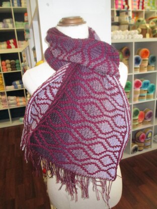 Overlay Mosaic crochet, you can make scarf larger or smaller by adding or taking away multiples of 14 chains to start with. i used 3/ 4 of a ball of lavenderlicious whirl and 2 pomegranate whirlettes. 3.5mm hook. This pattern made to gauge is 175cm long by 27cm wide. Can be made bigger