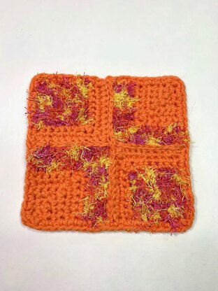 Based on a quilter’s block pattern, create a colorful dish scrubby that combines cotton and textured yarn for a multi purpose cleaning. Step by step YouTube video available. Dish cloth is 5 ¾” x 5 ¾”.