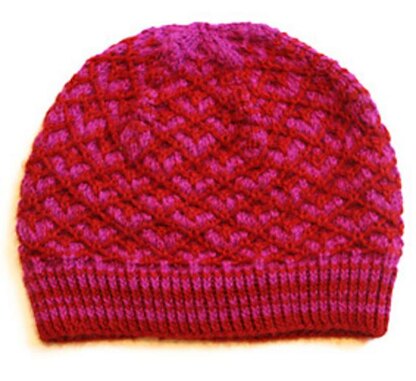 This beanie is worked in a clever two colour quilted stitch that uses 2 different methods of slipping stitches to create a gorgeously dense fabric that’s snug to wear. I’ve chosen a rich colour combination of chestnut and fuschia but it would also look great worked in a single colour for a more subtle textural look