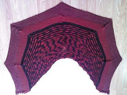 The shawl is worked top-down and is a one-piece, symmetrical knit. I alternate the red/black variegated yarn with black yarn. The border is red followed by burgundy yarn. There are 3 cables on the red border and 4 cables on the burgungy border. Gauge is unimportant.