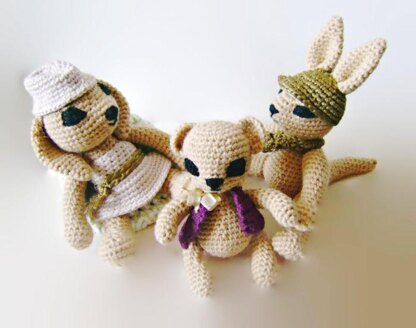 Three patterns for a bunny rabbit, teddy bear and kangaroo.