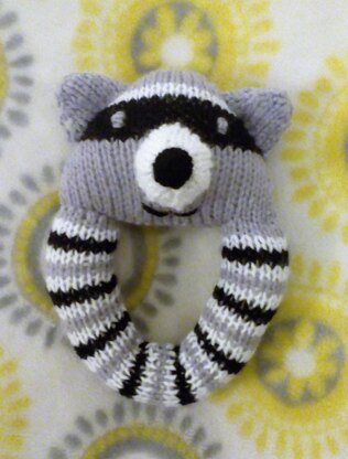 One of my lovely online knitting friends suggested a raccoon would make a cute rattle. Having never seen one it took me a while, and a lot of looking at pictures, but I finally finished this design. I am really pleased with how he turned out and think any baby would enjoy playing with him. I put a rattle insert in the head and crinkle material in the ears for extra interest.