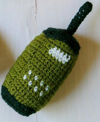 Baby rattle shaped like a military radio. Make it in olive green, gray, black or camouflage yarn to coordinate with military baby sweater.