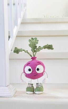 The finished product, made with the materials specified in this pattern, measures 15 cm (5.9 inches) in length without leaves, and the height of the leaves ranges from 10 to 15 cm (3.9 inches). This crochet pattern provides detailed written instructions for creating the toy, including the body, arms, legs, and leaves. The pattern consists of 16 pages and is accompanied by more than 30 photographs. The radish's body is crocheted in continuous spirals as one piece. The legs and arms are made from a wireframe, which we sew onto the body. The leaves are crocheted separately and then sewn onto the garment.