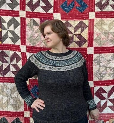 Yarn: Chaos Fiber Co. DK, 100% Superwash merino wool, 260 yards/100g. Sample knit in Black Cat (main), Driftwood (neutral), and Moonlight Stroll (contrast). My 44” sample took 4.25 skeins of the main color and less than 1/8 skein of each of the others. Your yardage will vary based on size knit and length. Plan on 3(3, 4, 5, 6, 7) skeins of main color.