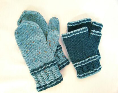 These fingerless mitts and mittens both start at the wrist with a garter rib. The gusseted “sore thumb” sits at the side so they can be worn on either hand. The mittens decrease to a point at the top. The fingerless mitts end with garter stitch rounds to match the cuff. Three sizes are included in this easy, knit and purl design. The small amount of contrast color used make these a great pattern for using up your leftovers. Think of the variations you can make!
