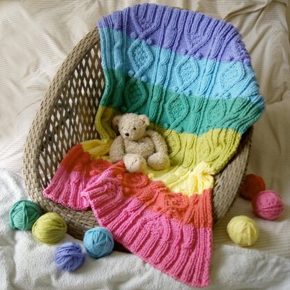 A bright and cheery rainbow crib size blanket, knitted in traditional aran pattern with a modern twist.