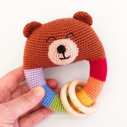 Crochet a cute Rainbow Bear Baby Rattle for your baby cub or as a gift for a baby shower.