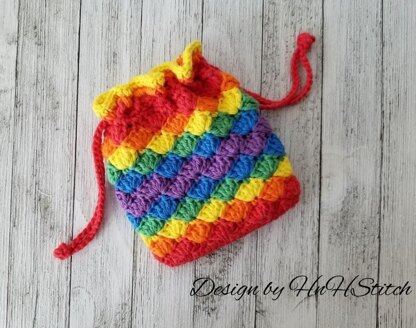 Rainbow colored pouch with drawstrings.