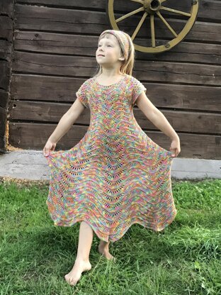 The “Rainbow Dress for Little Miss” is knitted using Debbie Bliss Eco Baby Prints organic cotton. It is a cosy, slightly flared cotton dress for any little girl wishing to look like an inspiring fashionista, with wavy pattern from the neckline to the hem. The dress features round neckline, slightly flared skirt and short sleeves. It’s an easy to wear pull-on with a loose-fitting top. The skirt sits below the knees. For this seamless dress, knitted top down, you begin with the neck. As this dress is designed with a turtleneck neckline, it is very easy to start. The sleeves and the bottom of the dress are finished in the same style as neckline. The big advantage of working top down is that you can adjust the length of the sleeves and dress length to suit your needs.