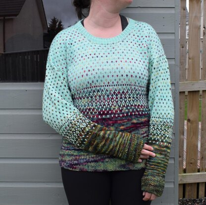 This beautiful pullover was inspired by the gorgeous colours of the rainbow and the rain as shown by the fairisle detail which looks like rainbow rain drops. This design is part of a collection of four patterns with the Rainbow Drops motif (which includes leg warmers, hand warmers, pullover, and cowl).