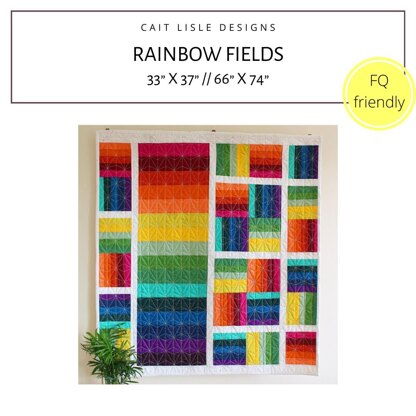 Rainbow Fields is a super quick and easy pattern that you can whip up in no time! Perfect for beginner quilters, go full rainbow or switch it up with a two colour ombré for a striking and fun quilt.\n\nThe downloadable pattern includes:\n\nEasy to follow directions for Baby (33” x 37”) and Throw (66” x 74”) quilts\nHelpful tips and diagrams for how to strip-piece and assemble your quilt top\nLots of ideas for different colour schemes and a colouring page to help you choose your fabric layout and colours\nFat Quarter and Fat Eighth friendly\nSuitable for beginners\n\nShare your projects with the #RainbowFieldsQuilt and #caitlisledesigns hashtags!