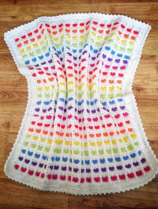 The rainbow of hearts blanket is mainly crochet with double crochet (treble UK) and cluster stitches for the hearts so it’s fairly quick to work up. The finished blanket will measure 30 inches wide x 33 inches long. But can be made larger or smaller by adding or reducing stitches. Written in US terms with abbreviations for UK Materials 900 meters of main colour dk / weight 3 yarn (I used Emu Classic 320g white 3 balls and a part ball) 100 meters of each x 7 rainbow colours dk / weight 3 yarn (I used Emu Classic parrot pack plus a pink) 4mm hook The pdf is 6 pages with pictures