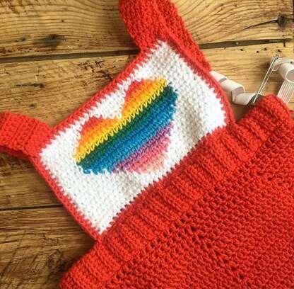 The Rainbow pinafore works up in sizes ; 6-12 Months; 1 year; 2 years; 3 Years; 4 Years