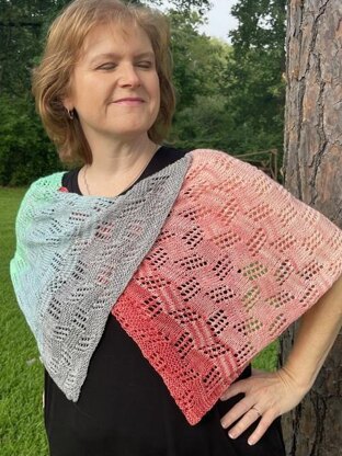 The button placement on this versatile rectangular garment makes it a shrug, a cowl, a stole, a scarf. The lace keeps the warmth down in summer heat but offers just enough coverage for chilly evenings. The colorways in the Savvy Skeins set together reminded me of my very favorite summer treat when we would go to the city as a kid. The Rainbow Sherbet stole doesn’t need to be made with a mini set, but it adds to the fun.