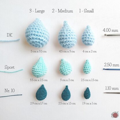 Raindrop 1 – Small4.00 mm Hook, DK Yarn: 1.5” (4 cm) by 0.8” (2 cm) 2.50 mm Hook, Sport Yarn: 1” (2.5 cm) by 0.6” (1.5 cm) 1.10 mm Hook, Mercerized Cotton n 10: 0.75” (1.9 cm) by 0.4” (1 cm)