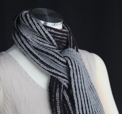 I wanted to design a good introduction to brioche that still captured some of the dramatic effects that it is known for. Working in two colors is often easier than working in one since you can easily see which stitch is to be slipped and which is to be worked. When you work two-colored ribbing over an odd number of stitches, the same color rib runs up each side, keeping the colors balanced. This pattern uses two-color brioche with a selvedge for neat edges. It is squishy and reversible. Instructions are written for syncopated brioche, which changes the dominant-colored rib by switching knit stitches to purl. Optional instructions are given to eliminate the syncopated step, which creates a scarf with a predominantly light color on one side and dark color on the other side. This long, reversible unisex scarf is best worked in 100% worsted weight, non-treated wool which helps hold its shape. At only .035 grams per yard, Morehouse Farms 3-Strand Worsted yarn weighs less than most other wor
