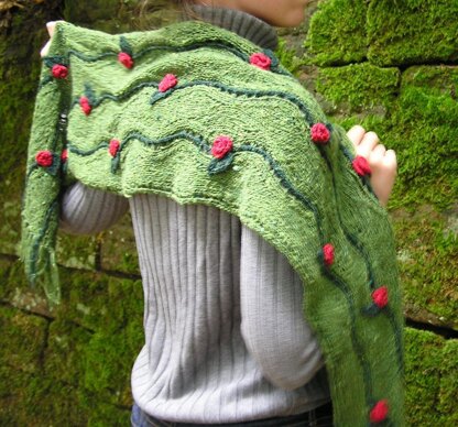 This shawl is knitted with two skeins of Lang Yarns Donegal. The stems, the leaves and the roses are crochet. I used lang yarns Seta tweed for the roses and Lang Yarns Donegal for the leaves and the stems. (about 10 grams each colour)