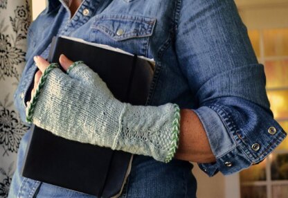 A mid-forearm length fingerless glove. The pattern takes two colors of yarn, the body yarn and about 40 yards of a secondary or contrasting color (estimated yardage on the safe side.)