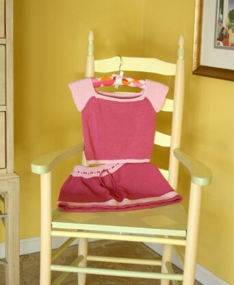 Sized from 4-12, the outfit features a raglan top knit from the bottom up and garter stitch sleeves in a coordinating color as well as a skirt knit in the round from the top down. The skirt has a drawstring waist for an adjustable fit.