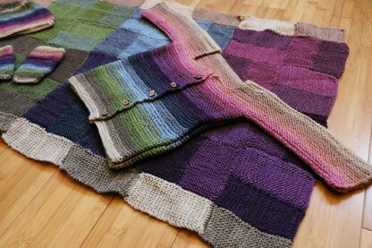 Yarn - Wonderland Yarns “So Fond of Rainbows” in Mad Hatter weight, shown in “Enchanted Woodlands” The cardigan itself uses approximately 300-400 yds. The remainder is used to make the blanket, booties, & hat.