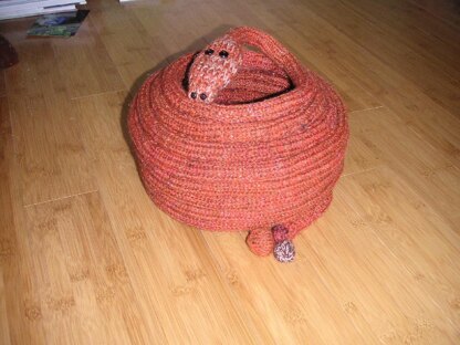 This is the second piece in my “Noisy Knitting” series. I have several beautiful Southwest Native American ceramic pots and was looking for a basket to hold odds and ends in our family room. After several trips to home decor shops and finding nothing that worked for color and style, I made my own. The rattle is made by knitting covers for craft store 'jingle bells'. The core of the basket is cotton piping so it is much faster to knit then an entire basket made from I-cord. I dyed the piping with Kool-aid to soften the bright white color (directions included). I found a curved upholstery needle the best tool for assembly. I worked with stash with a variegated sock and sport weight yarns, which gave the basket a range of colors (sorry hard to see in the photos). The head and tail are easy to make and I included a photo of the head before assembly in the pattern. The head makes a handle (