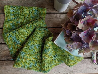The wrap is designed as a short scarf designed to be work in the style of a cowl or neck wrap. It is also designed to use up as much of the yardage as possible so it is important to pay attention to the tension you are working at.
