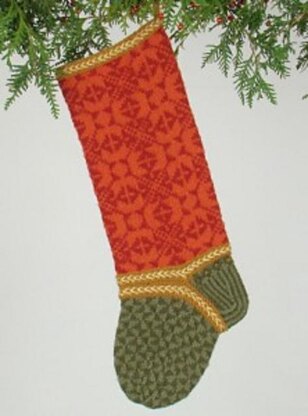 Pattern provides clear written instructions, along with color charts to knit a Christmas stocking in the round.