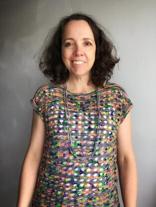A lace Tunisian crochet top worked up in fingering weight yarn. Sized to be inclusive. Crocheted in two pieces from the hem up, in a repeating lace pattern. Then it is blocked, and then seamed at the shoulders and sides including sleeves. This is an easy to intermediate pattern.