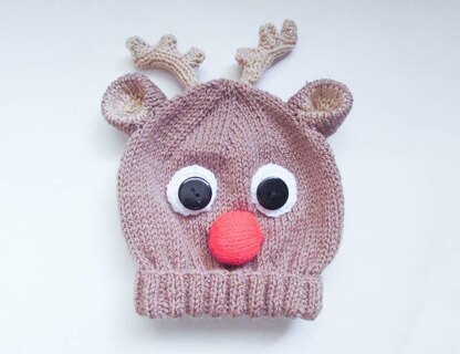 Adorably cute Reindeer Baby Beanie Hat. Very easy and quick to make with lots of pictures to help you along the way. This hat pattern is knitted flat on 2 needles and seamed up the back and is entirely knit. It will look adorable for a Christmas time photo shoot and keep your cutie snug and warm