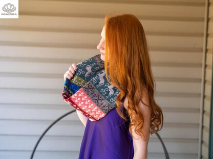 Renaissance faire themed cowl with jewel toned colors. The cowl is worked in the round to form a tube seamlessly. This method encases all the yarn floats and creates a double sided accessory.