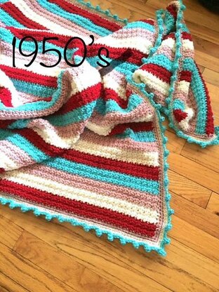 Classic colors of cherry red, rosy cheeks pink, turquoise and bright ivory define the ‘50’s. Simple stripes and a pom pom border bring the decade to today’s home.