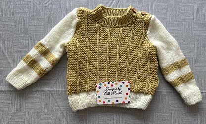 Our Rhidian design is a jumper with a textured pattern to the front and back, and stocking stitch to the sleeves. It has button holes and the shoulders for ease of dressing. This pattern is suitable for a beginning with some experience of knit and purl stitches. It has been knitted using Baby DK yarn. It uses 3.25mm and 4mm knitting needles. It will fit age ranges 6 months to 3 years, which is 18” to 22” chest sizes.