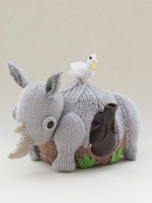 This is a lovely tea cosy and the rhino and cattle egret make a great pair to share teatime with and they are fun to knit and add character into.