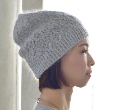A lightweight hat matching Rhombi cardigan. It is worked from the bottom up with 2 yarns held together.