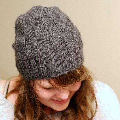 Rhomboid is a slightly slouchy hat, knit in the round from the bottom up. It features a wide, ribbed brim and geometric rhombus relief design using knit and purl stitches. The design is carried through the crown for seamless decreases.