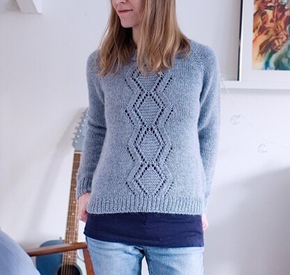 Rhombus Sweater is a slightly cropped, raglan sleeved sweater with a simple lace pattern on front. It’s worked from top down in Sportweight yarn that’s held double.