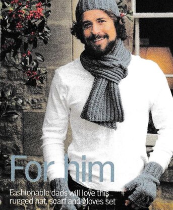 This is a pattern for a man s accessories set. It has patterns for a scarf, hat and fingerless gloves. It is in a simple rib stitch, and the gloves are in stocking stitch with a rib cuff. The hat and scarf are fine for beginners. Yarn quantities are for the full set. Photos Knit Today.
