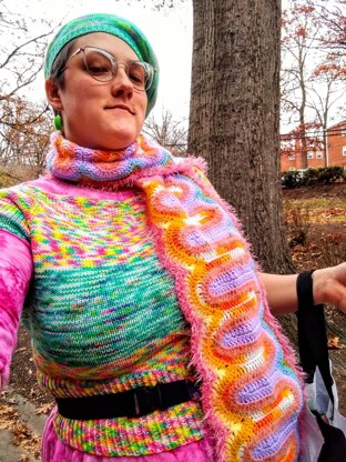Ribbons of Rainbow Scarf is a simple variation of my Ribbon Candy Swatch scarf. It uses three rows of Double Crochet to build an undulating central motif. The design is finished with 3 rows of symmetrical border for a smooth, modern appearance.