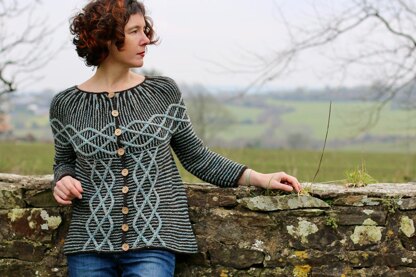 The delicate weaving of cables across a garter stitch background is just magical! This gently shaped cardigan is fun to knit and easy to wear. This cardigan begins by working the upper yoke from left to right side using short row garter wedges to shape the neck. You then pick up stitches for the lower yoke that are divided for the body and sleeves.