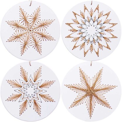 Ces magnifiques décorations d'arbre au design étoilé seront parfaites pour embellir votre sapin de Noël ou pour offrir en cadeau à un ami ou un membre de la famille. Paquet de 8 boules à broder en carton blanc avec du coton mouliné doré et argenté. Décorations imprimées. Utilisez une aiguille pointue pour percer les trous de broderie puis commencez à coudre.