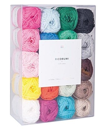 Tricotez et crochetez de jolis jouets et accessoires avec ce pack de 20 pelotes de fil de Rico, présenté dans une belle boîte cadeau. Ce fil doux au look mat est 100% coton - chaque pelote fait 25g et convient pour des aiguilles de 2-4mm. L'ensemble est conçu pour fonctionner parfaitement avec les livres Ricorumi ainsi qu'avec d'autres patrons de tricot double.
