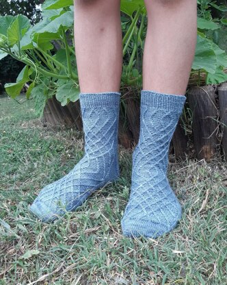 Ricochets socks include a motif pattern of slipped stitches which intersect and intertwine as circles in the water. This motif is much easier that it seems.