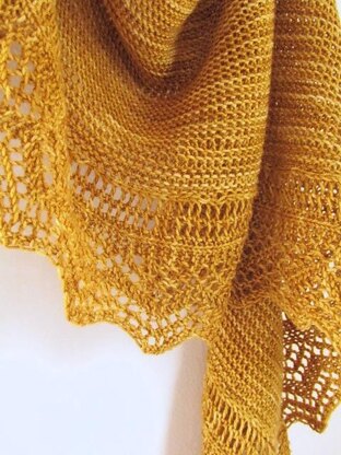 This shawl requires approximately 425 yards (160 g) of DK weight 4-ply yarn. It is recommended that one alternate skeins while working the body of the shawl if using hand-dyed yarn, as is recommended for this pattern. The edging pattern begins with a set-up row on the right side of the fabric because the cable cast-on method is worked from what will become the wrong side of the fabric. The stitch pattern of the lace edging is primarily worked on the wrong side rows. This is not a design error.