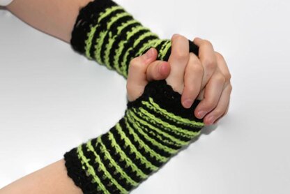 A snug fitting, textured and striped pair of fingerless gloves.