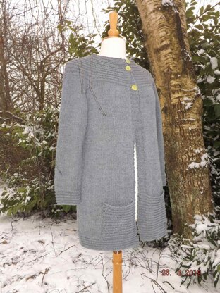 Riflet is a long cardigan with long sleeves and pockets. Riflet is worked back and forth from the bottom edge and up with a round yoke. This pattern is made for a yarn with a gauge of 25 stitches per 10 centimeters (i.e. a yarn with a yardage of approximately 120 meters per 50 grams).