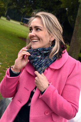 Rigel is the brightest star in the constellation of Orion. The star looks blue-white to the naked eye. Knit from the top down, this cowl is soft and a fun way to use special buttons. The stitch pattern is my Colorway Accented Stockinette. Similar to the approach used for the Rigel Mitts, this pattern spotlights small bursts of color, making it ideal for colorways with a dominant color accented by a mini rainbow or speckles.