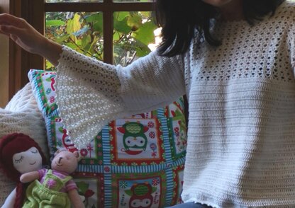 This top is crocheted bottom up in piece for the body and top down for the sleeve. The contrast between double stitches and laces ended with bell shape sleeve brings dramatic fun effect.